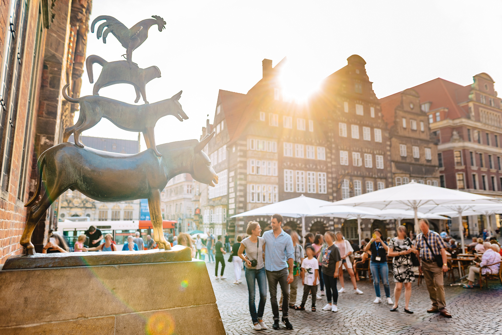 1.200 Jahre Tradition und Weltoffenheit prägen Bremen, die Hansestadt an der Weser. Die alte Handelsstadt mit ihrem historischen Zentrum rund um den Marktplatz verströmt das Flair einer jungen Großstadt. Und dennoch wird jeder, der sich mit offenen Augen auf Zeitreise begibt, Zeugen der langen Geschichte und jede Menge spannende Geschichten finden. In Bremen gibt es Häuser, die sich wie Perlen an einer Schnur aneinanderreihen, Esel, die einander „Guten Tag“ sagen, und Kathedralen, die unter sorgsamer Beobachtung stehen. Unverwechselbar bleiben das prächtige Rathaus im Stil der Weserrenaissance und die ehrwürdige Figur des Roland auf dem historischen Marktplatz. Sie verkörpern seit 1404 den Bürgerwillen nach Unabhängigkeit. Rathaus und Roland stehen als einzigartiges Welterbe der Menschheit unter dem Schutz der UNESCO, doch auch der Schnoor – Bremens ältestes Stadtviertel –, die ungewöhnliche Architektur der traditionsreichen Böttcherstraße oder der Bremer Dom suchen ihresgleichen. Das heimliche Wahrzeichen der Hansestadt steht mit dem Rücken zum Rathaus und dem Gesicht zum Liebfrauenkirchhof. Dabei handelt es sich um die Bronzestatue der Bremer Stadtmusikanten. Das Märchen von den Sagengestalten ist in aller Welt bekannt und seit den Brüdern Grimm so eng mit Bremen verbunden wie Rathaus und Roland. Wer den Esel an den Beinen berührt, hat einen Wunsch frei. Doch die Geste will gelernt sein. Mit beiden Händen müssen Esels Beine leicht gerieben werden, sonst geht der Wunsch nicht in Erfüllung.