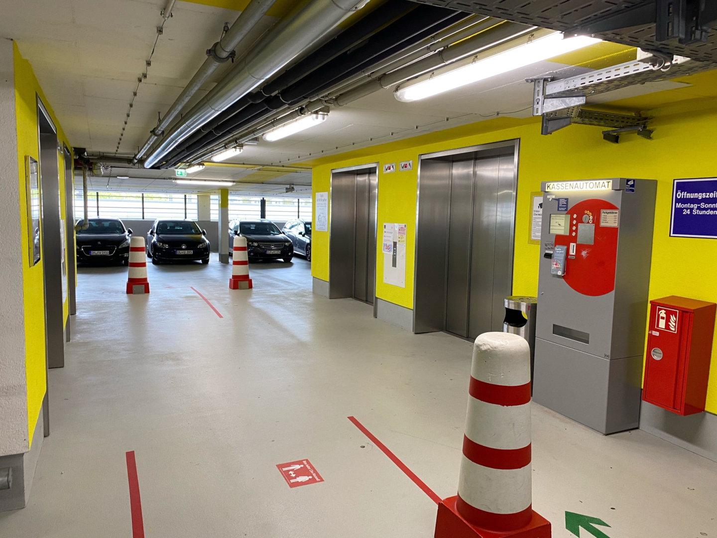 Zum Öffnen der Tür halte einfach deine gültige Park- oder Parkwertkarte an den Sensor. Über den Aufzug oder das entsprechende Treppenhaus gelangst du dann zum jeweiligen Parkdeck.