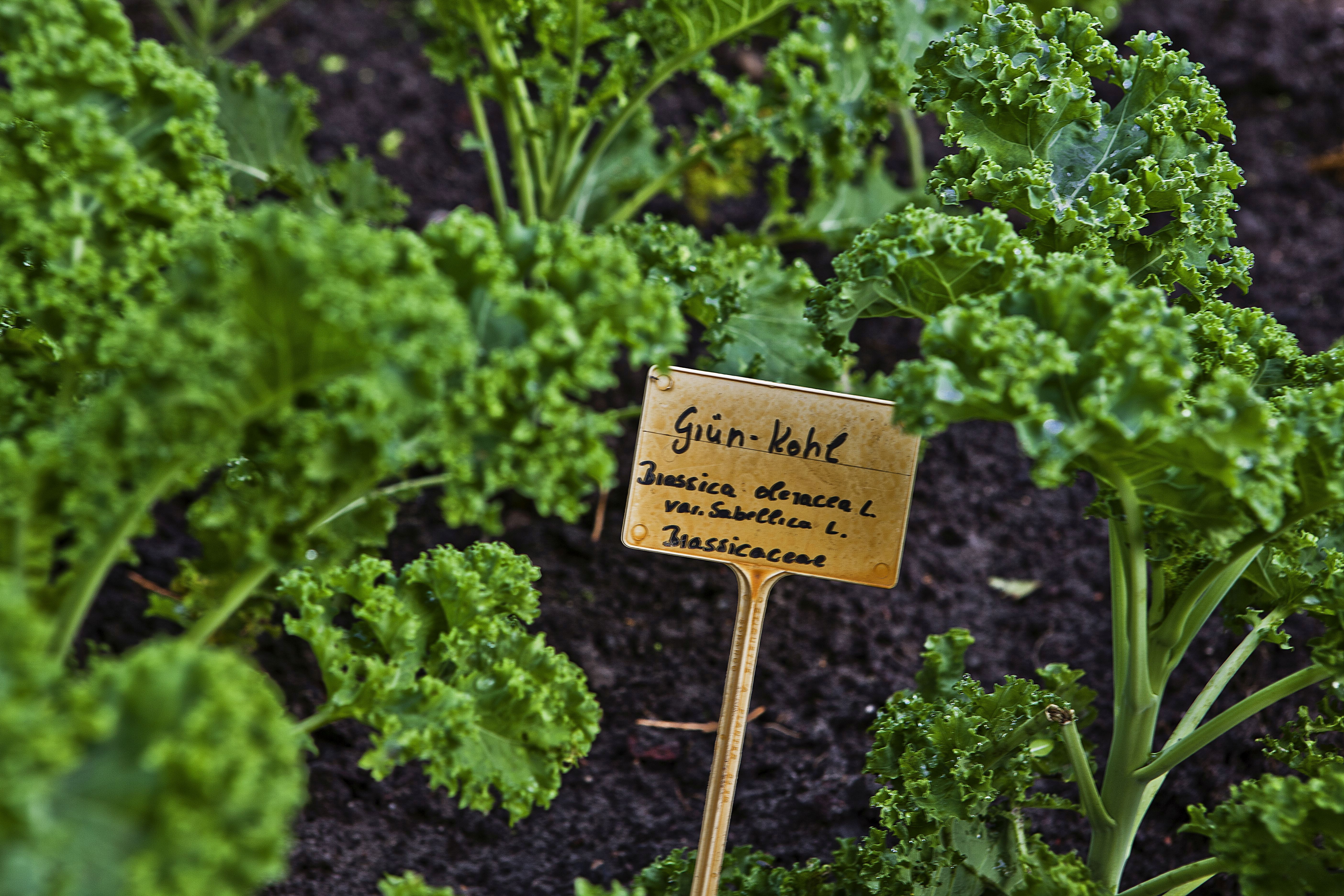 Grünkohlpflanze mit Sortenschild