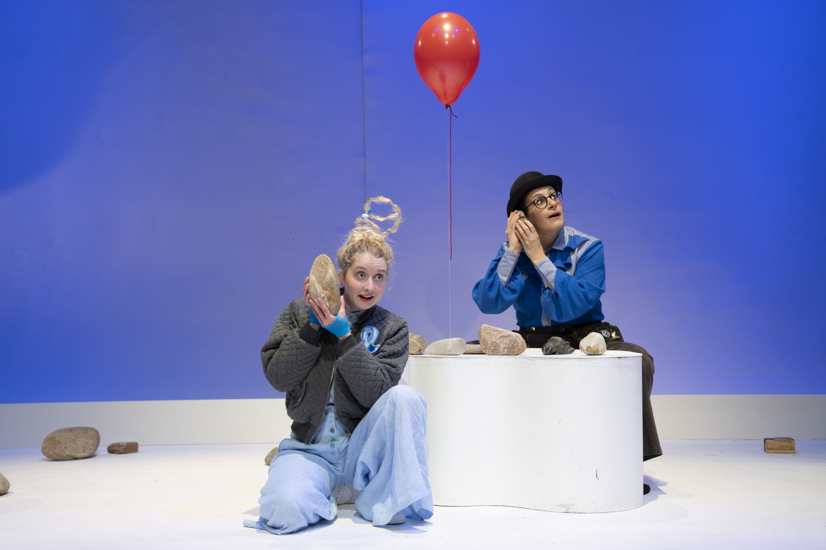 Schauspielerin tanzt auf Bühne, im Hintergrund schweben Ballons, die an Steinen festgemacht wurden, es ist eine andere Darstellerin zu sehen. Blauer Himmel und Wolken rahmen das Bühnenbild.